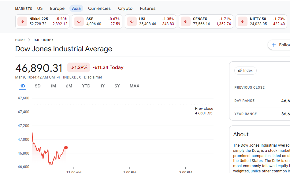 Global Economic Uncertainty | Dow Jones 09 March 2026