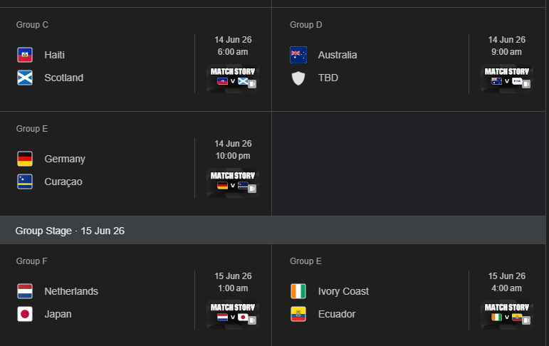 | Jun 14 | Ivory Coast vs Ecuador | E |